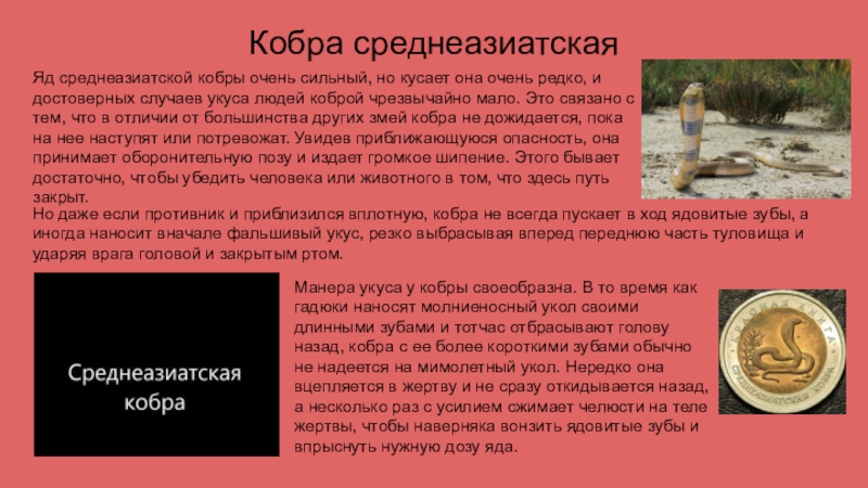 Яд среднеазиатской кобры очень сильный, но кусает она очень редко,