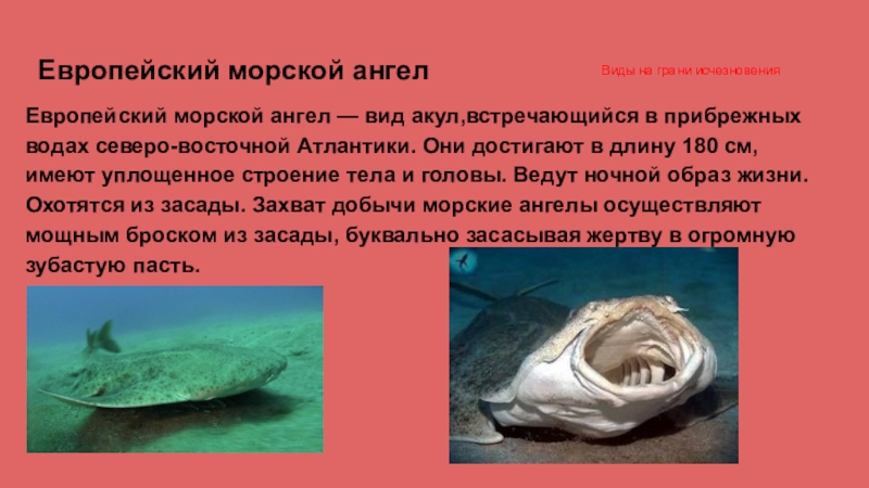 северо-восточной Атлантики. Они достигают в длину 180 см, имеют уплощенное строение тела и головы. Ведут ночной образ жизни. Охотятся из засады. Захват добычи морские ангелы осуществляют мощным броском из засады, буквально засасывая жертву в огромную зубастую пасть.
