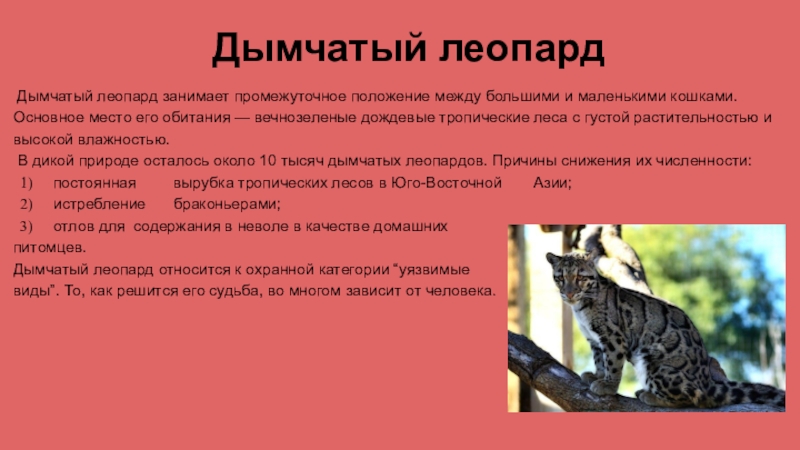 В дикой природе осталось около 10 тысяч дымчатых леопардов. Причины снижения их численности: