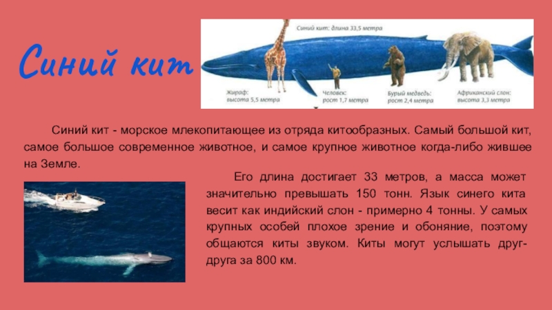 Его длина достигает 33 метров, а масса может значительно превышать 150 тонн. Язык синего кита весит как индийский слон - примерно 4 тонны. У самых крупных особей плохое зрение и обоняние, поэтому общаются киты звуком. Киты могут услышать друг-друга за 800 км.