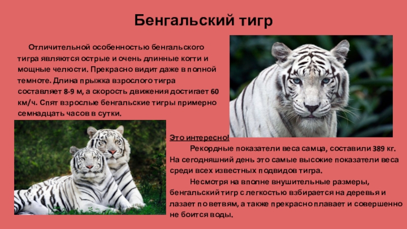 очень длинные когти и мощные челюсти. Прекрасно видит даже в полной темноте. Длина прыжка взрослого тигра составляет 8-9 м, а скорость движения достигает 60 км/ч. Спят взрослые бенгальские тигры примерно семнадцать часов в сутки.
