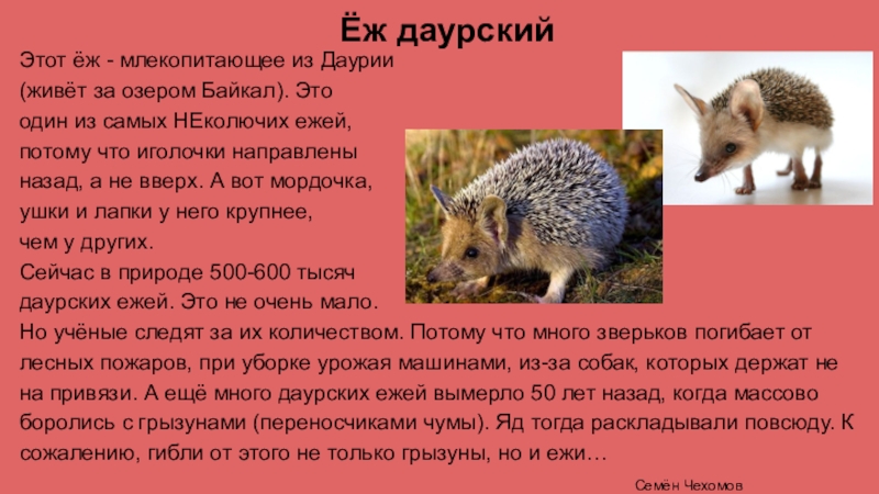 Но учёные следят за их количеством. Потому что много зверьков погибает от лесных пожаров, при уборке урожая машинами, из-за собак, которых держат не на привязи. А ещё много даурских ежей вымерло 50 лет назад, когда массово боролись с грызунами (переносчиками чумы). Яд тогда раскладывали повсюду. К сожалению, гибли от этого не только грызуны, но и ежи…