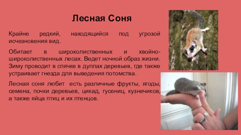 Лесная соня любит есть различные фрукты, ягоды, семена, почки деревьев, цикад, гусениц, кузнечиков, а также яйца птиц и их птенцов.
