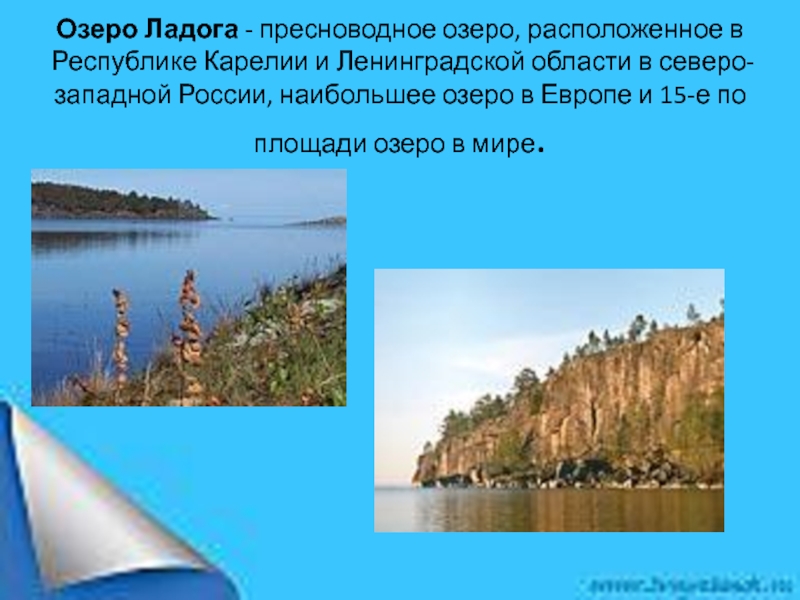Слайд 7Озеро Ладога - пресноводное озеро, расположенное в Республике Карелии и Ленинградской области