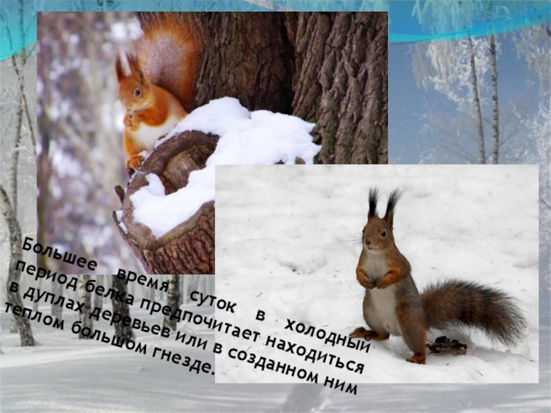 Большее время суток в холодный период белка предпочитает находиться в дуплах деревьев или в созданном ним теплом большом гнезде.