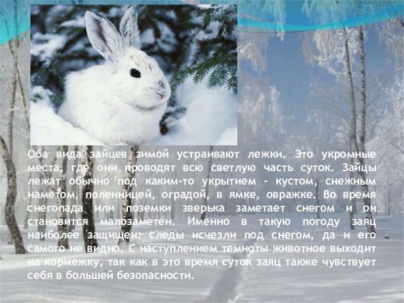 Оба вида зайцев зимой устраивают лежки. Это укромные места, где они проводят всю светлую часть суток. Зайцы лежат обычно под каким-то укрытием - кустом, снежным наметом, поленницей, оградой, в ямке, овражке. Во время снегопада или поземки зверька заметает снегом и он становится малозаметен. Именно в такую погоду заяц наиболее защищен: следы исчезли под снегом, да и его самого не видно. С наступлением темноты животное выходит на кормежку, так как в это время суток заяц также чувствует себя в большей безопасности.