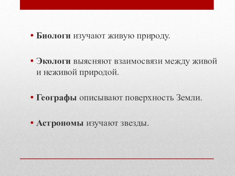 Биологи изучают живую природу.Экологи выясняют взаимосвязи между живой и неживой природой.Географы описывают поверхность Земли.Астрономы изучают звезды.