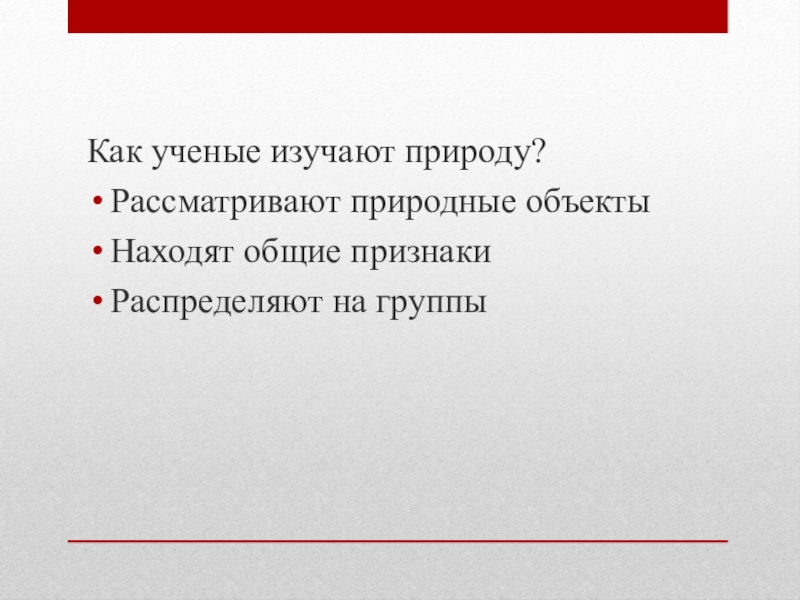 Как ученые изучают природу?Рассматривают природные объектыНаходят общие признакиРаспределяют на группы