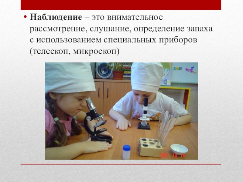 Наблюдение – это внимательное рассмотрение, слушание, определение запаха с использованием специальных приборов (телескоп, микроскоп)
