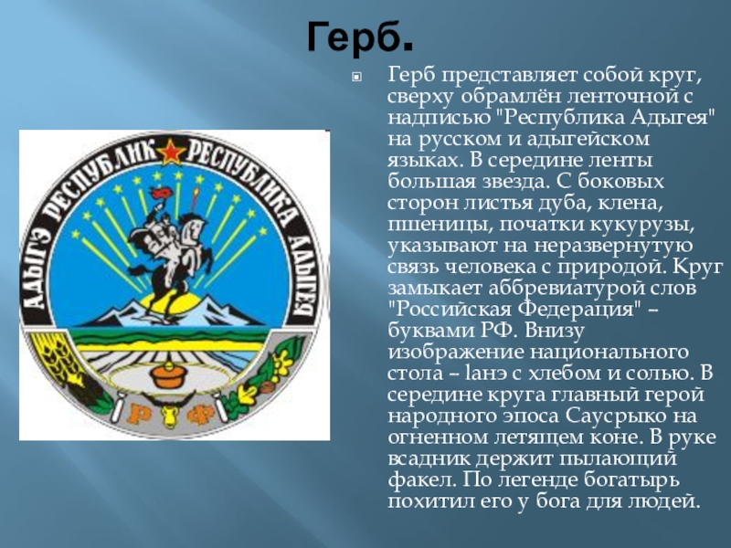 на русском и адыгейском языках. В середине ленты большая звезда. С боковых сторон листья дуба, клена, пшеницы, початки кукурузы, указывают на неразвернутую связь человека с природой. Круг замыкает аббревиатурой слов "Российская Федерация" – буквами РФ. Внизу изображение национального стола – lанэ с хлебом и солью. В середине круга главный герой народного эпоса Саусрыко на огненном летящем коне. В руке всадник держит пылающий факел. По легенде богатырь похитил его у бога для людей.