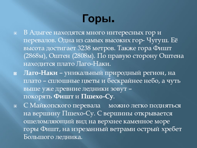 В Адыгее находятся много интересных гор и перевалов. Одна из самых