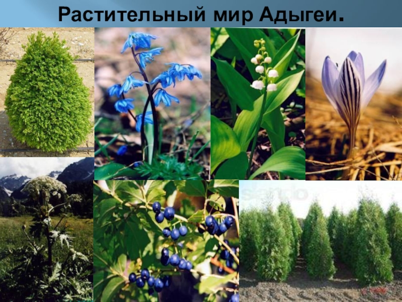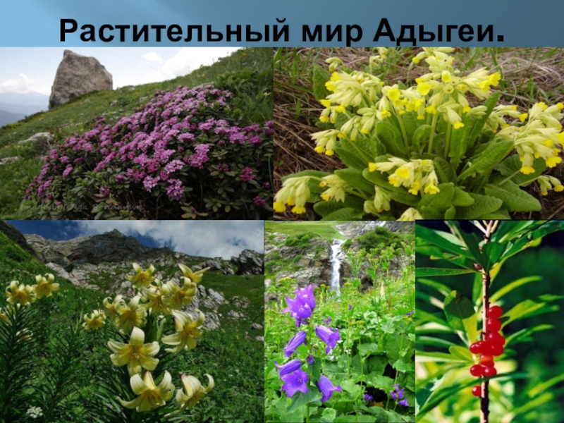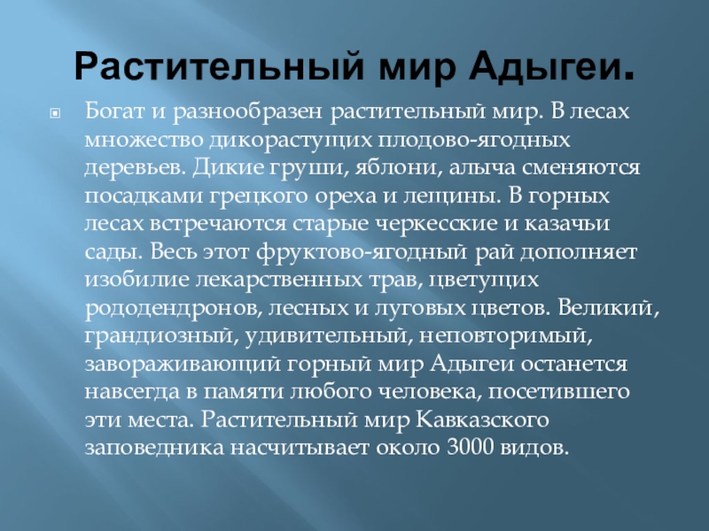 плодово-ягодных деревьев. Дикие груши, яблони, алыча сменяются посадками грецкого ореха и лещины. В горных лесах встречаются старые черкесские и казачьи сады. Весь этот фруктово-ягодный рай дополняет изобилие лекарственных трав, цветущих рододендронов, лесных и луговых цветов. Великий, грандиозный, удивительный, неповторимый, завораживающий горный мир Адыгеи останется навсегда в памяти любого человека, посетившего эти места. Растительный мир Кавказского заповедника насчитывает около 3000 видов.