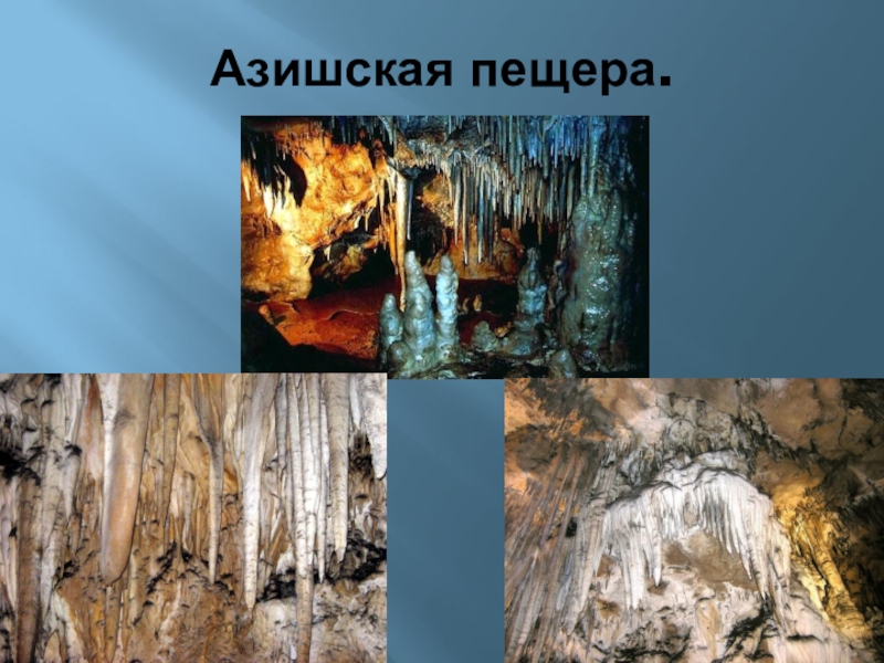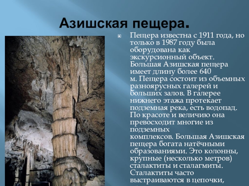 была оборудована как экскурсионный объект. Большая Азишская пещера имеет длину более 640 м. Пещера состоит из объемных разноярусных галерей и больших залов. В галерее нижнего этажа протекает подземная река, есть водопад. По красоте и величию она превосходит многие из подземных комплексов. Большая Азишская пещера богата натёчными образованиями. Это колонны, крупные (несколько метров) сталактиты и сталагмиты. Сталактиты часто выстраиваются в цепочки, протянувшиеся точно под пересекающими потолок трещинами.