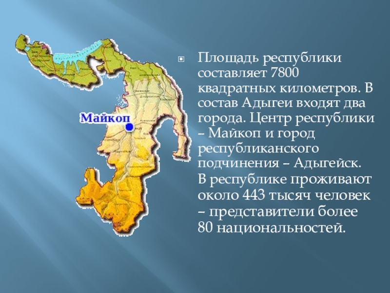Слайд 5Площадь республики составляет 7800 квадратных километров. В состав Адыгеи входят два