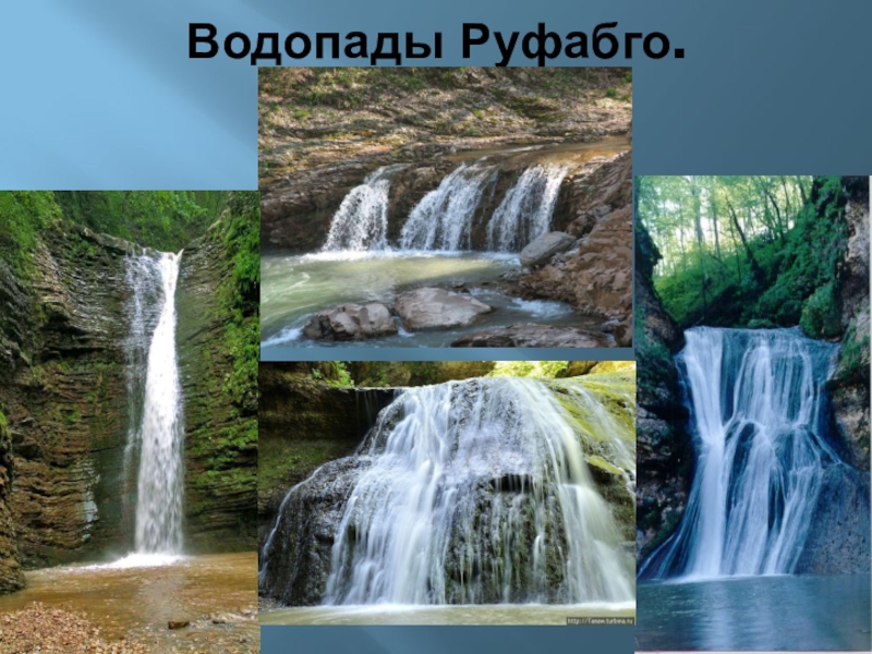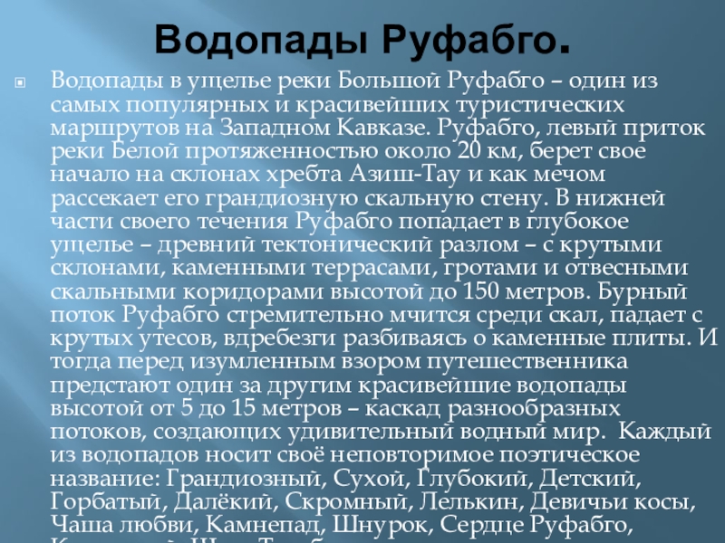 популярных и красивейших туристических маршрутов на Западном Кавказе. Руфабго, левый приток реки Белой протяженностью около 20 км, берет свое начало на склонах хребта Азиш-Тау и как мечом рассекает его грандиозную скальную стену. В нижней части своего течения Руфабго попадает в глубокое ущелье – древний тектонический разлом – с крутыми склонами, каменными террасами, гротами и отвесными скальными коридорами высотой до 150 метров. Бурный поток Руфабго стремительно мчится среди скал, падает с крутых утесов, вдребезги разбиваясь о каменные плиты. И тогда перед изумленным взором путешественника предстают один за другим красивейшие водопады высотой от 5 до 15 метров – каскад разнообразных потоков, создающих удивительный водный мир. Каждый из водопадов носит своё неповторимое поэтическое название: Грандиозный, Сухой, Глубокий, Детский, Горбатый, Далёкий, Скромный, Лелькин, Девичьи косы, Чаша любви, Камнепад, Шнурок, Сердце Руфабго, Каскадный, Шум, Три братца.