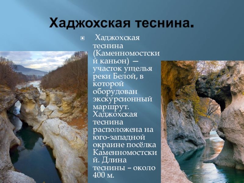 в которой оборудован экскурсионный маршрут. Хаджохская теснина расположена на юго-западной окраине посёлка Каменномостский. Длина теснины – около 400 м.