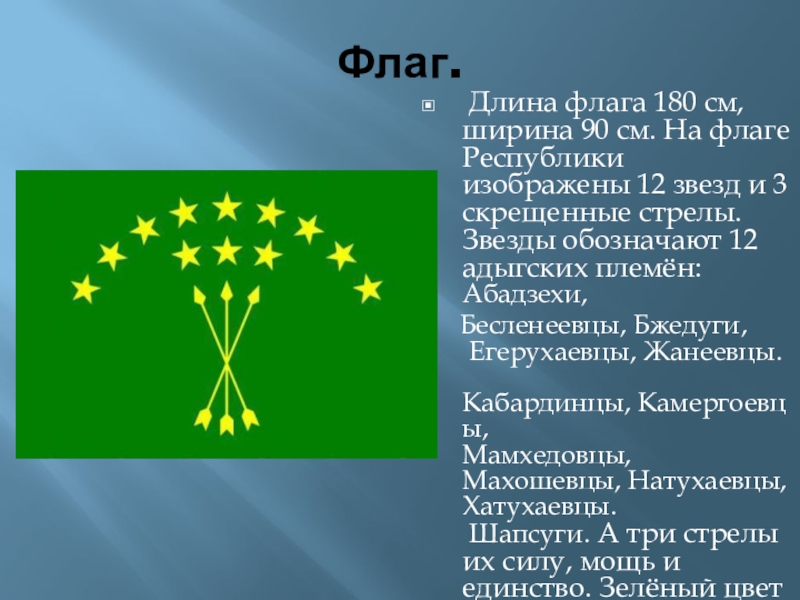 изображены 12 звезд и 3 скрещенные стрелы. Звезды обозначают 12 адыгских племён:Абадзехи,