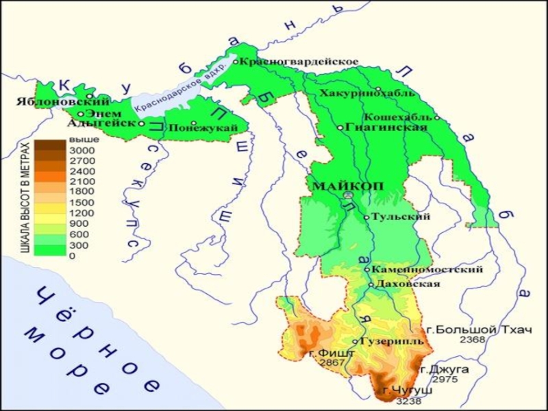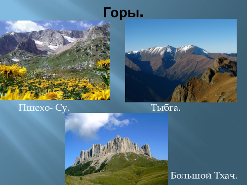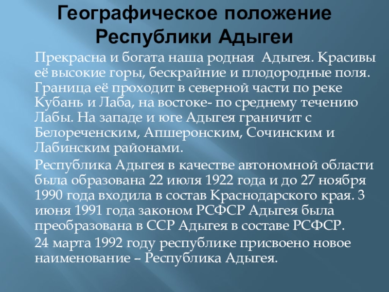Адыгея. Красивы её высокие горы, бескрайние и плодородные поля. Граница её проходит в северной части по реке Кубань и Лаба, на востоке- по среднему течению Лабы. На западе и юге Адыгея граничит с Белореченским, Апшеронским, Сочинским и Лабинским районами.
