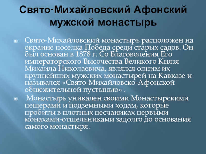 старых садов. Он был основан в 1878 г. Со Благоволения Его императорского Высочества Великого Князя Михаила Николаевича, являлся одним их крупнейших мужских монастырей на Кавказе и назывался «Свято-Михайловско-Афонской общежительной пустынью» .