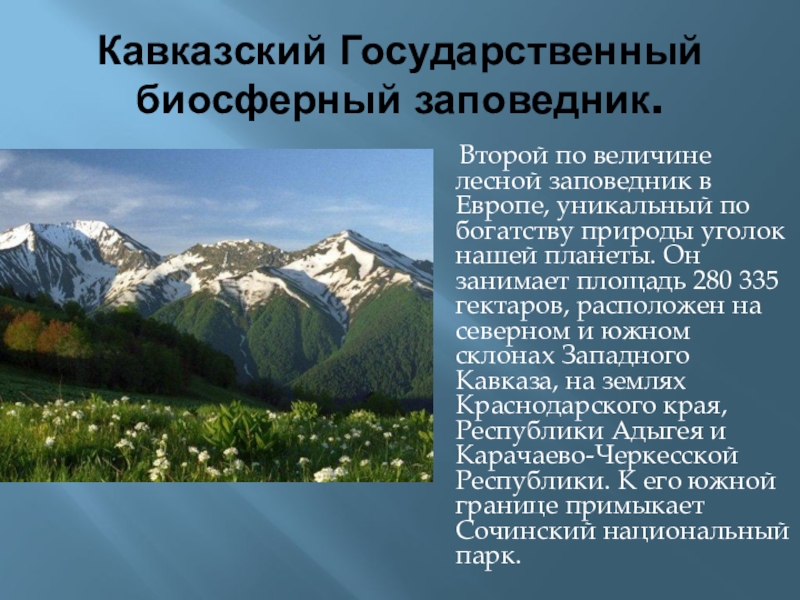 в Европе, уникальный по богатству природы уголок нашей планеты. Он занимает площадь 280 335 гектаров, расположен на северном и южном склонах Западного Кавказа, на землях Краснодарского края, Республики Адыгея и Карачаево-Черкесской Республики. К его южной границе примыкает Сочинский национальный парк.