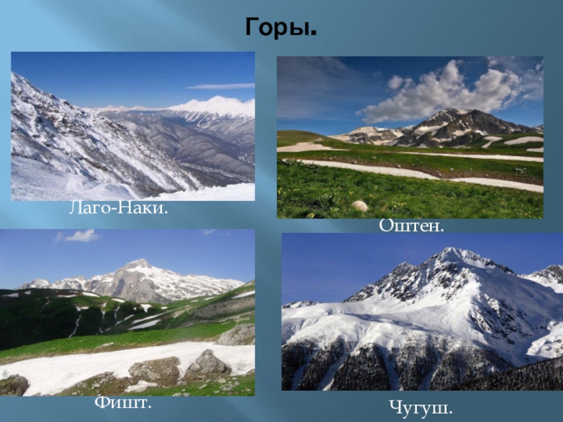 высоких гор- Чугуш. Её высота достигает 3238 метров. Также гора Фишт (2868м), Оштен (2808м). По правую сторону Оштена находится плато Лаго-Наки.
