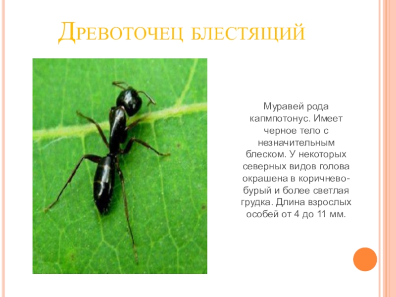 Древоточец блестящий  Муравей рода капмпотонус. Имеет черное тело с незначительным блеском. У некоторых северных видов