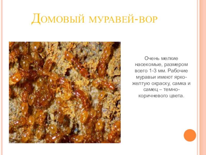 Домовый муравей-вор Очень мелкие насекомые, размером всего 1-3 мм. Рабочие муравьи имеют ярко-желтую окраску, самка и самец