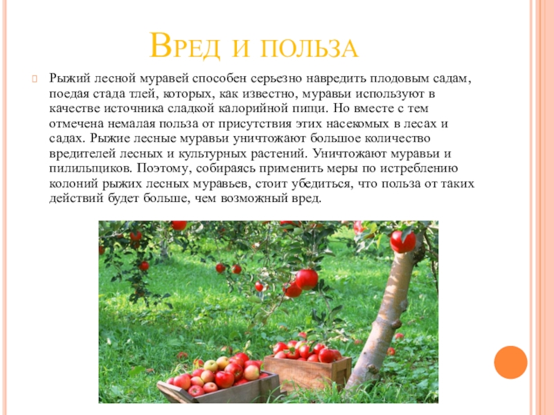 Вред и пользаРыжий лесной муравей способен серьезно навредить плодовым садам, поедая стада тлей, которых, как известно, муравьи