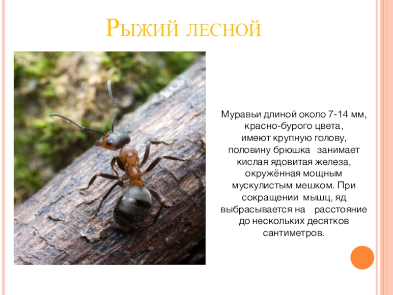 Рыжий лесной Муравьи длиной около 7-14 мм, красно-бурого цвета, имеют крупную голову, половину брюшка  занимает кислая ядовитая железа, окружённая мощным мускулистым мешком. При сокращении  мышц, яд выбрасывается на   расстояние до нескольких десятков сантиметров.
