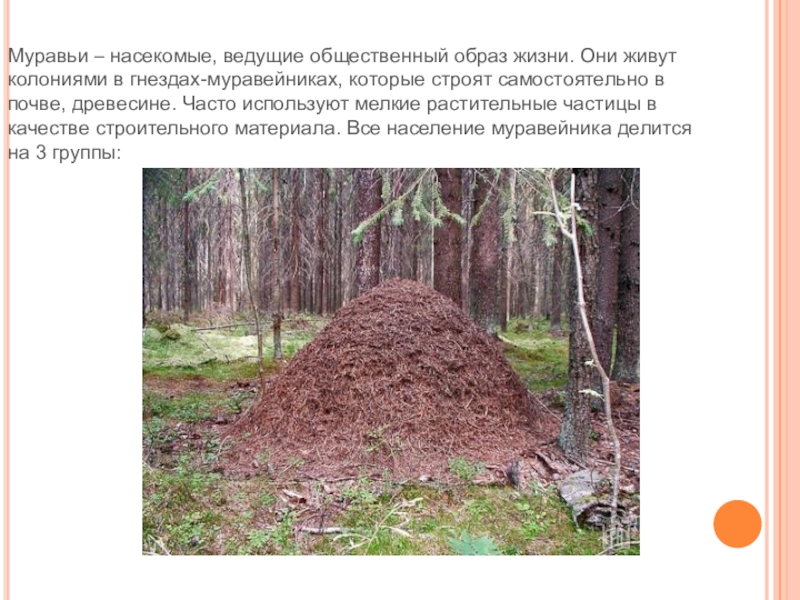Муравьи – насекомые, ведущие общественный образ жизни. Они живут колониями в гнездах-муравейниках, которые строят самостоятельно в почве, древесине. Часто используют мелкие растительные частицы в качестве строительного материала. Все население муравейника делится на 3 группы: