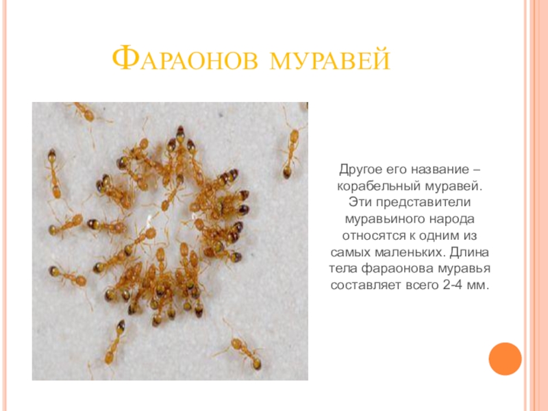 Фараонов муравей  Другое его название –корабельный муравей. Эти представители муравьиного народа относятся к одним из самых