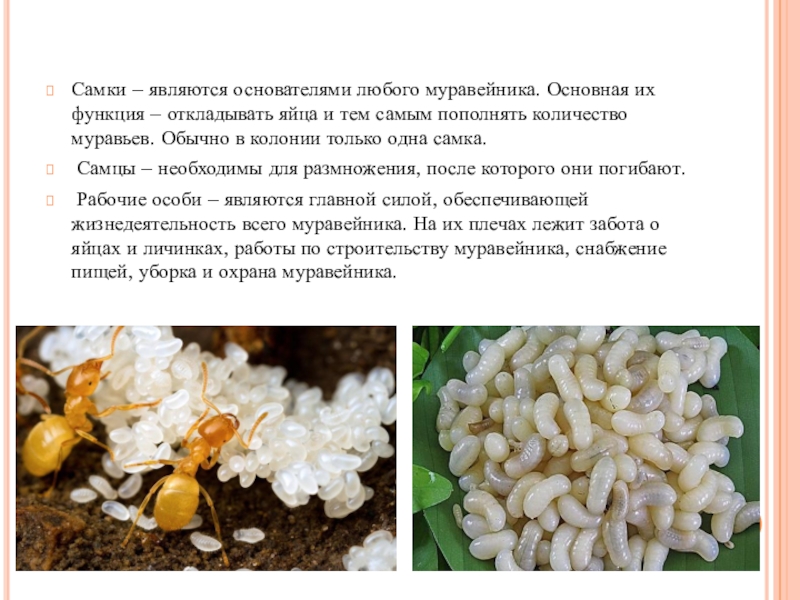 Слайд 6Самки – являются основателями любого муравейника. Основная их функция – откладывать