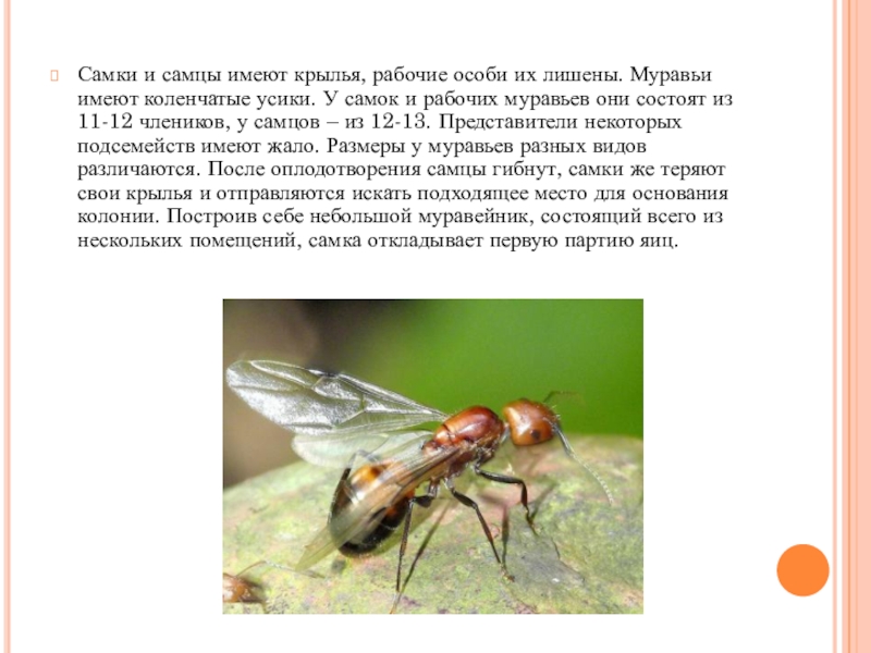 коленчатые усики. У самок и рабочих муравьев они состоят из 11-12 члеников, у самцов – из 12-13. Представители некоторых подсемейств имеют жало. Размеры у муравьев разных видов различаются. После оплодотворения самцы гибнут, самки же теряют свои крылья и отправляются искать подходящее место для основания колонии. Построив себе небольшой муравейник, состоящий всего из нескольких помещений, самка откладывает первую партию яиц.