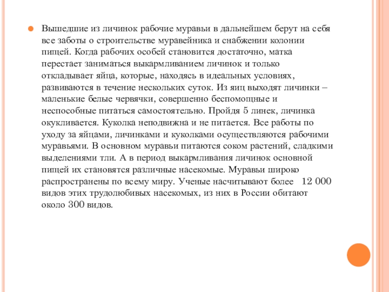 заботы о строительстве муравейника и снабжении колонии пищей. Когда рабочих особей становится достаточно, матка перестает заниматься выкармливанием личинок и только откладывает яйца, которые, находясь в идеальных условиях, развиваются в течение нескольких суток. Из яиц выходят личинки – маленькие белые червячки, совершенно беспомощные и неспособные питаться самостоятельно. Пройдя 5 линек, личинка окукливается. Куколка неподвижна и не питается. Все работы по уходу за яйцами, личинками и куколками осуществляются рабочими муравьями. В основном муравьи питаются соком растений, сладкими выделениями тли. А в период выкармливания личинок основной пищей их становятся различные насекомые. Муравьи широко распространены по всему миру. Ученые насчитывают более 12 000 видов этих трудолюбивых насекомых, из них в России обитают около 300 видов.