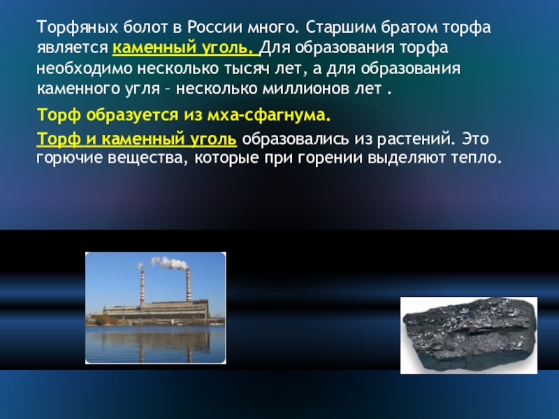 Слайд 16Торфяных болот в России много. Старшим братом торфа является каменный уголь.