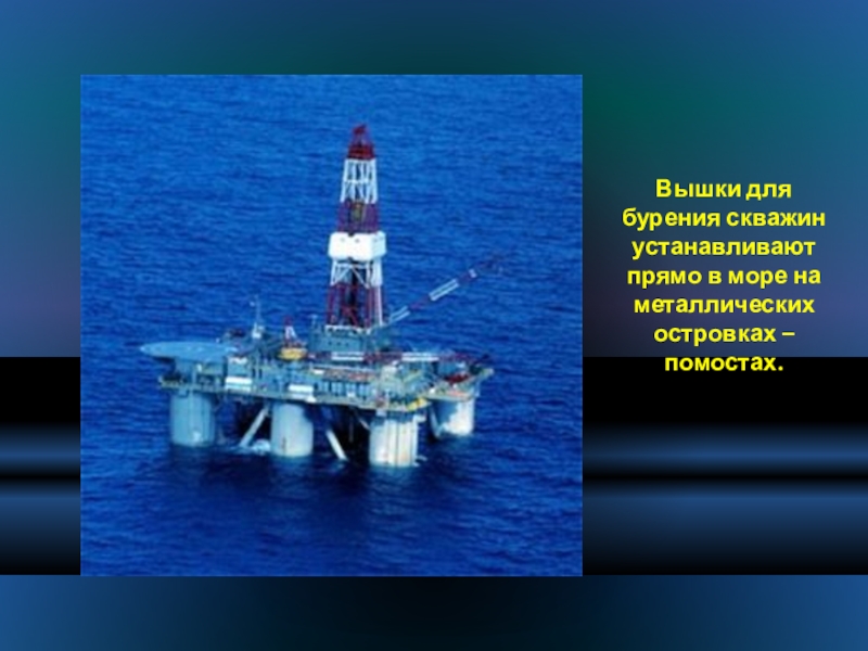 Слайд 25Вышки для бурения скважин устанавливают прямо в море на металлических островках
