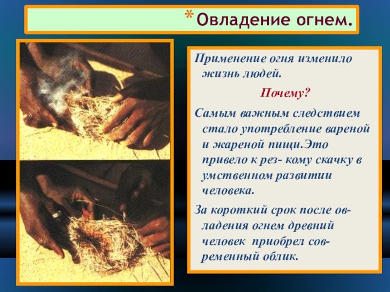 За короткий срок после ов- ладения огнем древний человек приобрел сов-ременный облик.