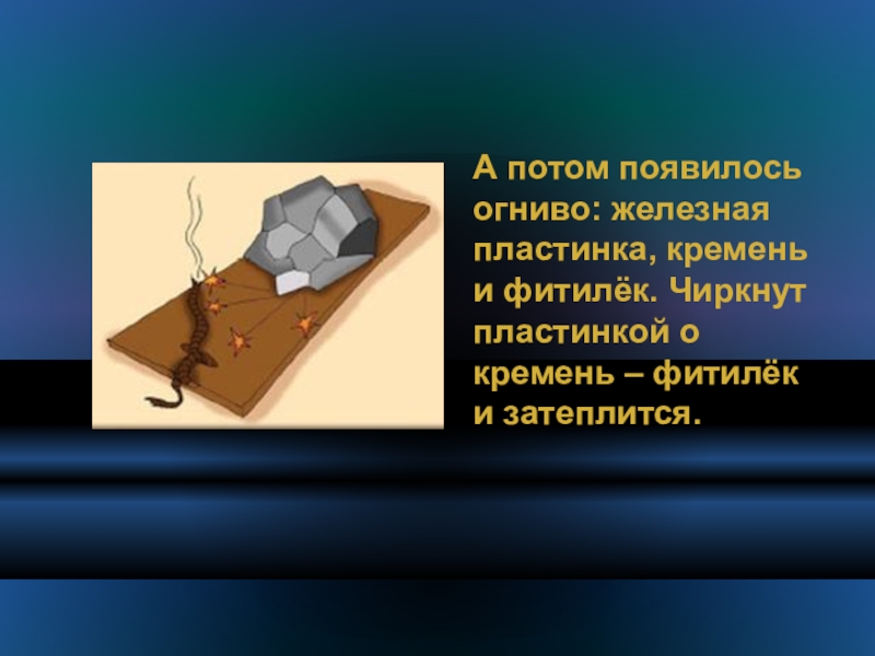 Слайд 6А потом появилось огниво: железная пластинка, кремень и фитилёк. Чиркнут пластинкой