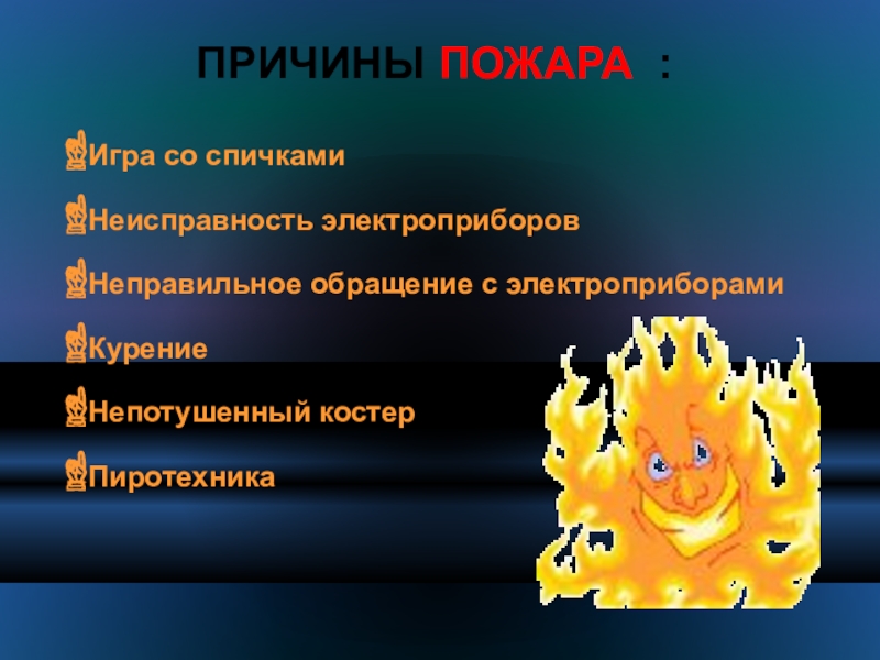 Слайд 49 ПРИЧИНЫ ПОЖАРА :