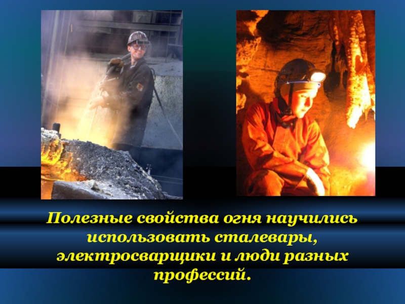 Слайд 32Полезные свойства огня научились использовать сталевары, электросварщики и люди разных профессий.