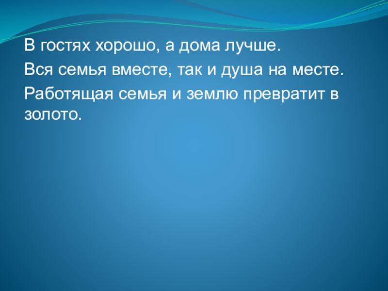 В гостях хорошо, а дома лучше.Вся семья вместе, так и душа на месте.Работящая семья и землю превратит