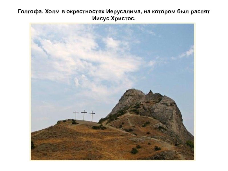 Слайд 20Голгофа. Холм в окрестностях Иерусалима, на котором был распят Иисус Христос.