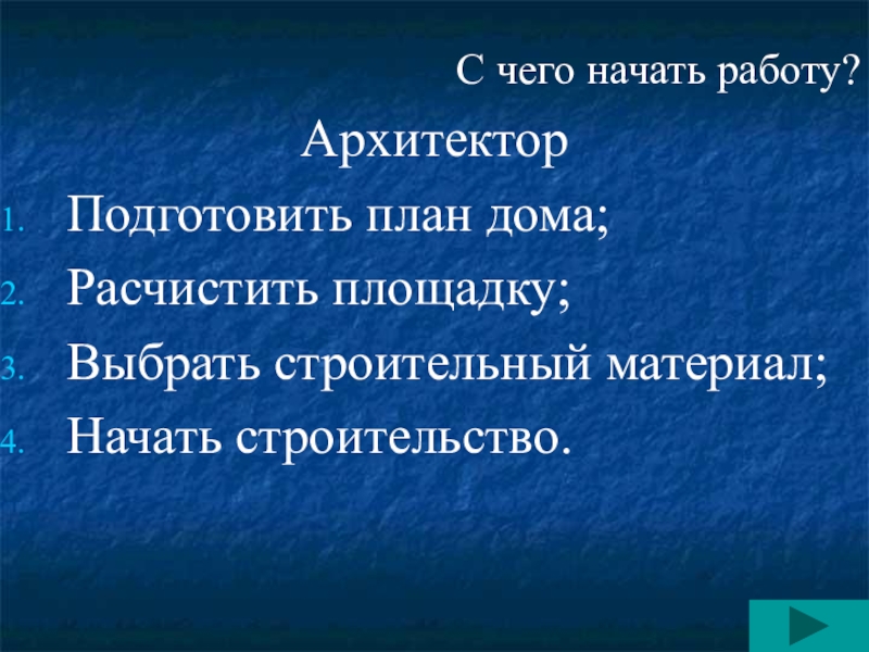 С чего начать работу?АрхитекторПодготовить план дома;Расчистить площадку;Выбрать строительный материал;Начать строительство.