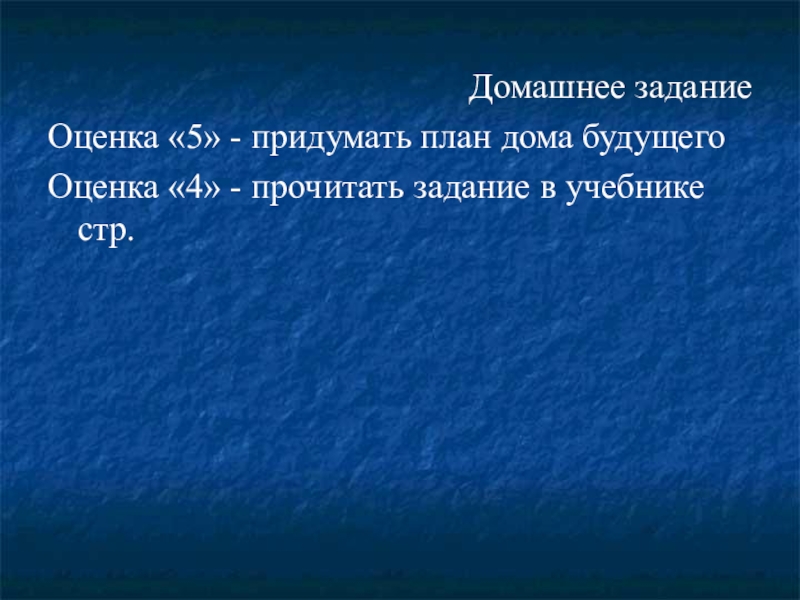 Домашнее заданиеОценка «5» - придумать план дома будущегоОценка «4» - прочитать задание в учебнике стр.