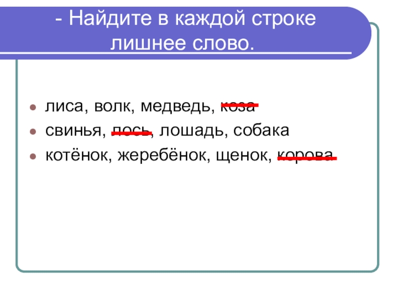 - Найдите в каждой строке лишнее слово. лиса, волк, медведь, козасвинья, лось, лошадь, собакакотёнок, жеребёнок, щенок,