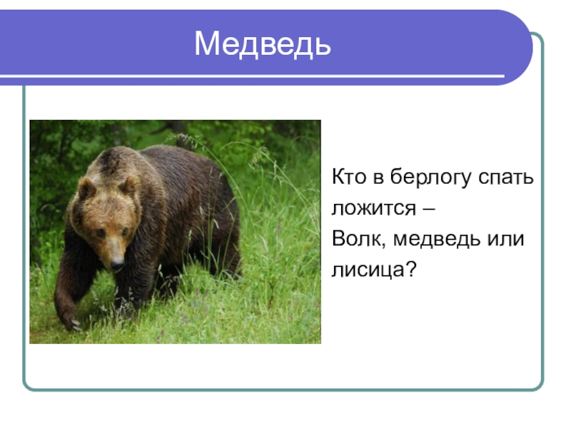 Медведь Кто в берлогу спатьложится –Волк, медведь илилисица?