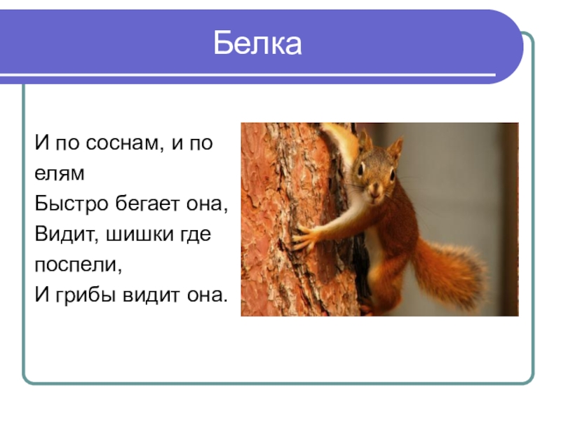 БелкаИ по соснам, и поелям Быстро бегает она, Видит, шишки гдепоспели, И грибы видит она.
