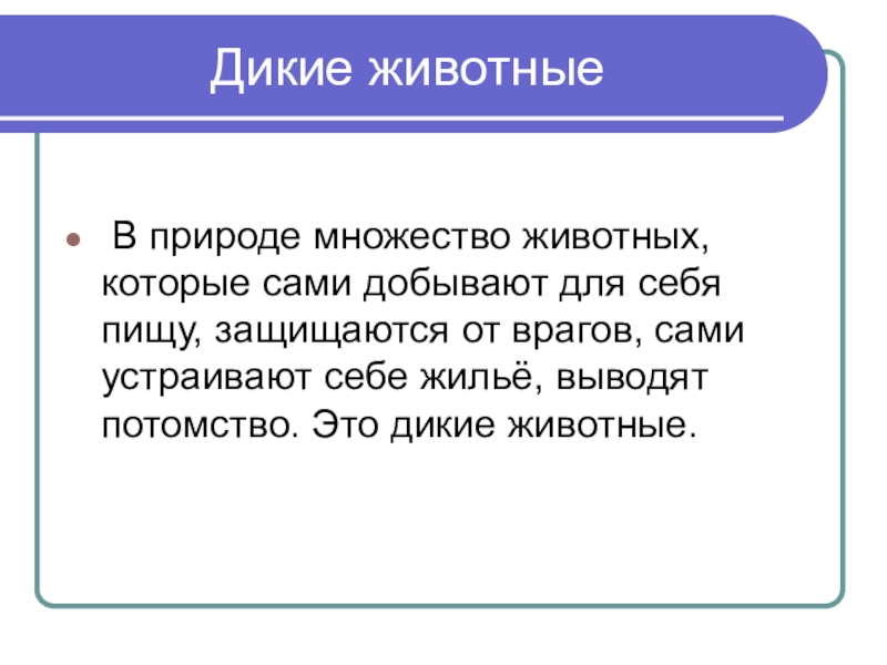 Дикие животные В природе множество животных, которые сами добывают для себя пищу, защищаются от врагов, сами устраивают