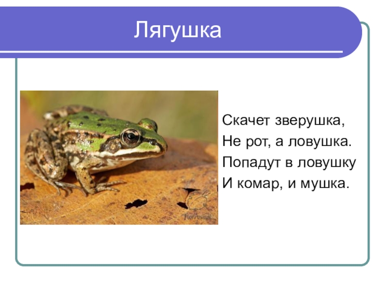 Лягушка Скачет зверушка, Не рот, а ловушка. Попадут в ловушку И комар, и мушка.