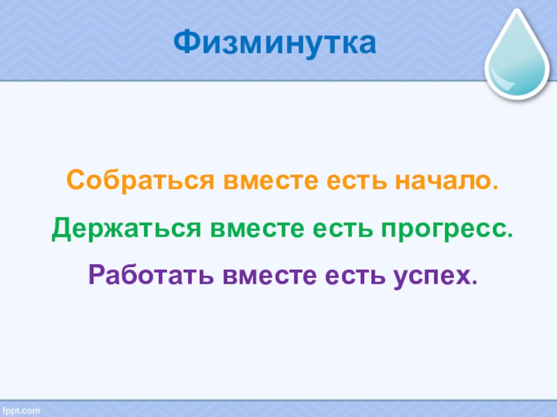 Физминутка Собраться вместе есть начало. Держаться вместе есть прогресс. Работать вместе есть успех.